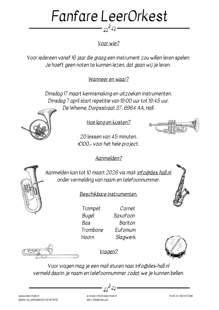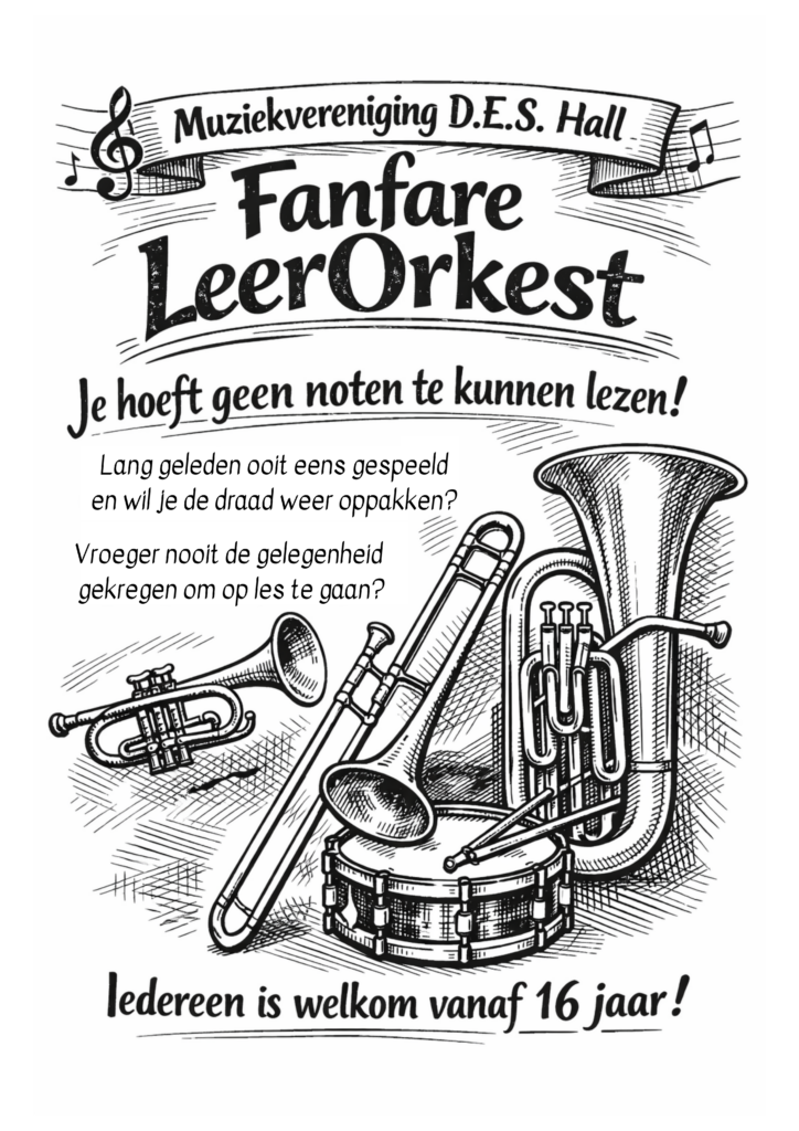 Muziekvereniging D.E.S. uit Hall onderscheidt zich van andere muziekverenigingen in de omgeving. Waarom? Onze vereniging is laagdrempelig en richt zich met name op wat er lokaal in ons dorp en in de buurt gebeurt. Jong en oud, de één met veel talent en de ander met wat minder, samen maken we herkenbare muziek en laten we van ons horen.