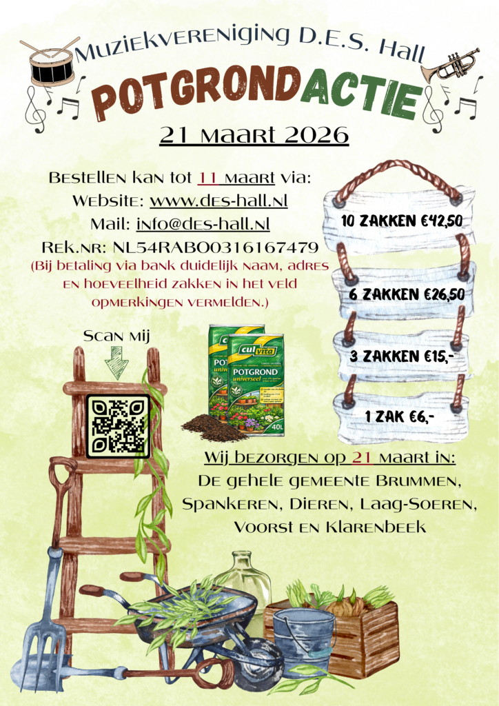 Muziekvereniging D.E.S. organiseert ook dit jaar weer de jaarlijkse potgrondactie! Door de aankoop van potgrond steun je direct onze vereniging, zodat wij kunnen blijven zorgen voor mooie muzikale momenten in onze gemeenschap.
